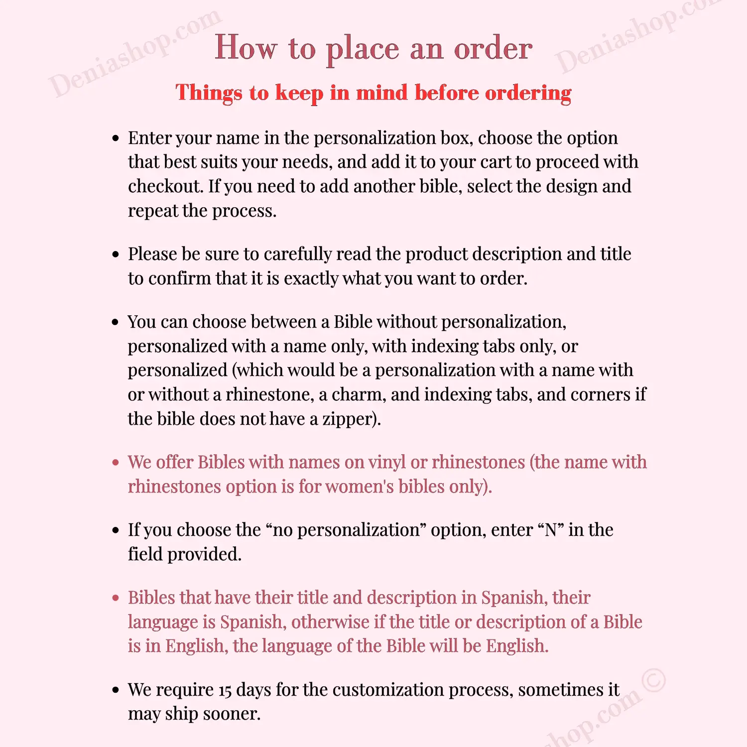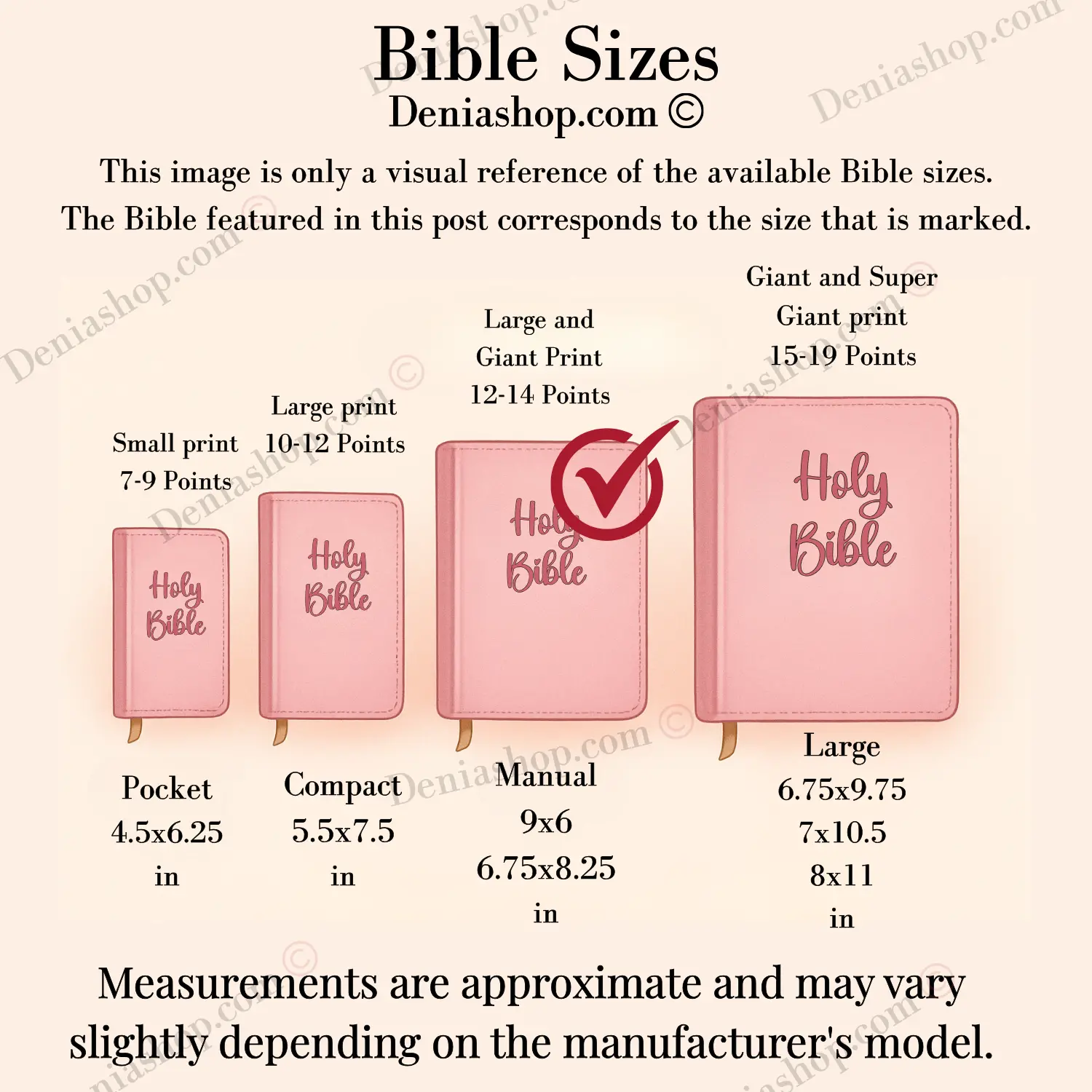 The color or type of rhinestones, charm, letter style, and name placement may vary slightly depending on material availability. Each Bible is handcrafted with care, always aiming for a beautiful and harmonious finish.